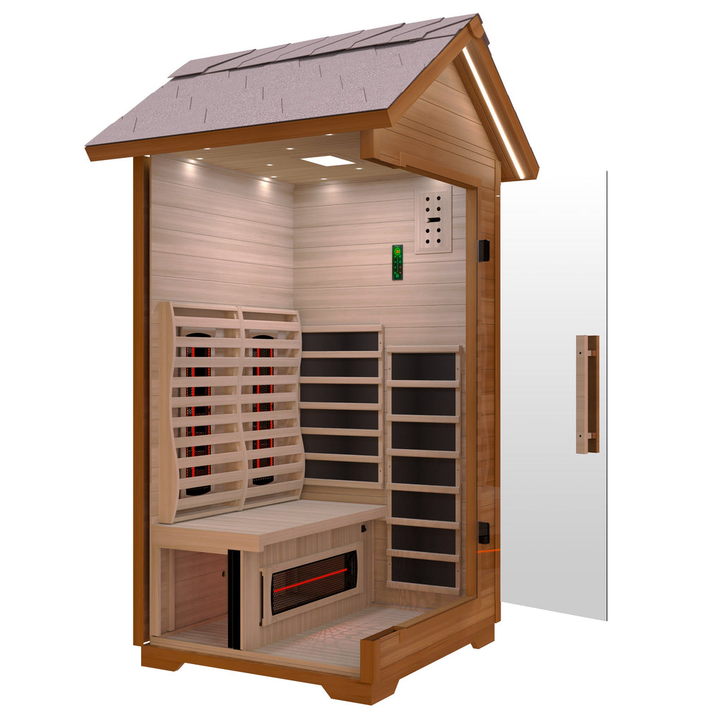 The SaunaSpa 2-Person Outdoor Cabin Sauna is designed for outdoor use and year-round relaxation. Crafted with a sustainably sourced Canadian red cedar and hemlock. The waterfroof far infrared heating panels deliver consistent warmth up to 149F. Bitumen roof shingles protect against rain and UV damage, and chromotherapy lighting for a calming ambiance. Complete with an 8mm clear tempered glass door with self-closing hinges, this sauna brings professional wellness to your own backyard.