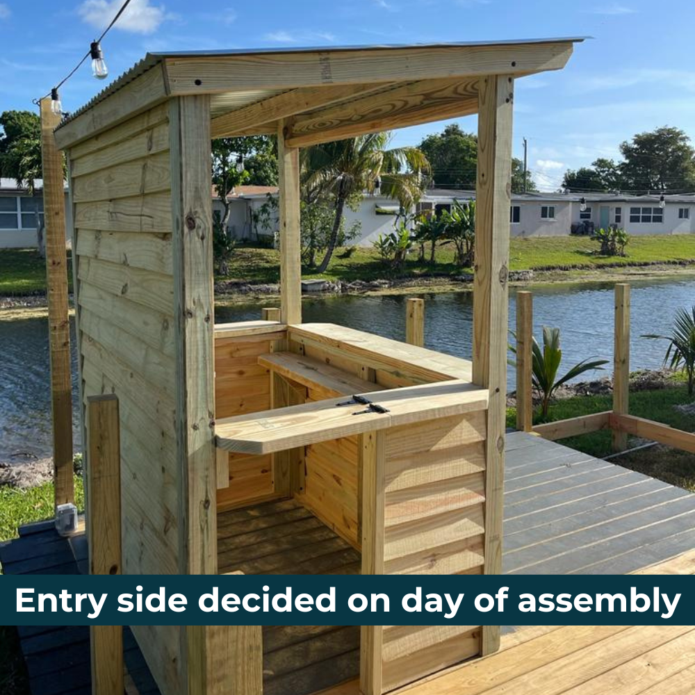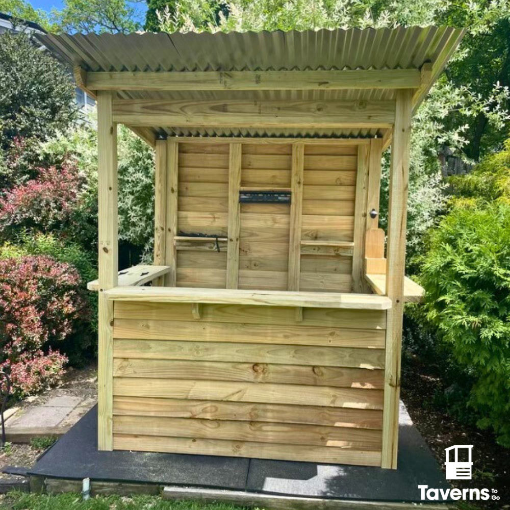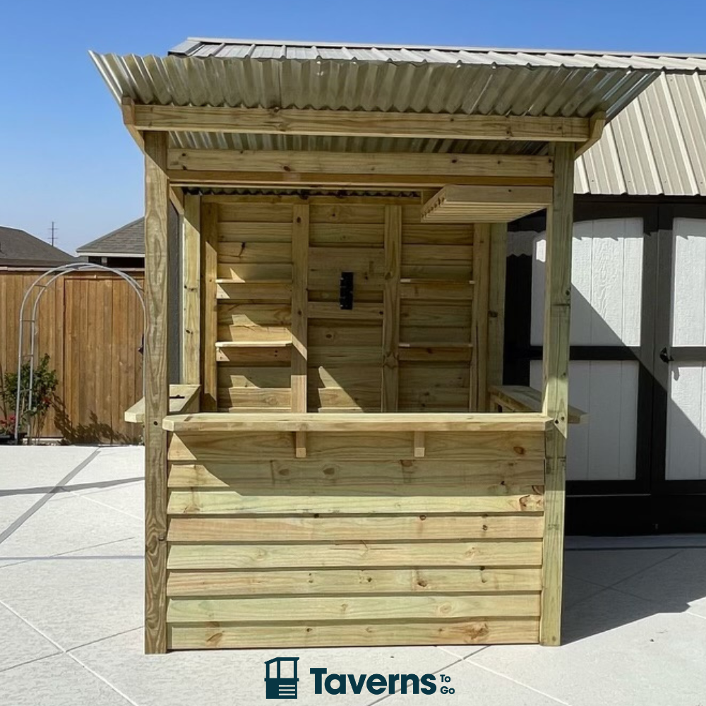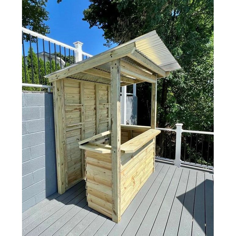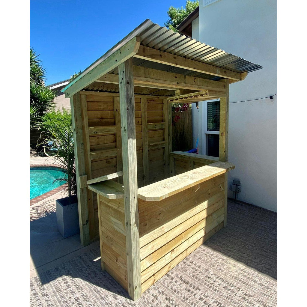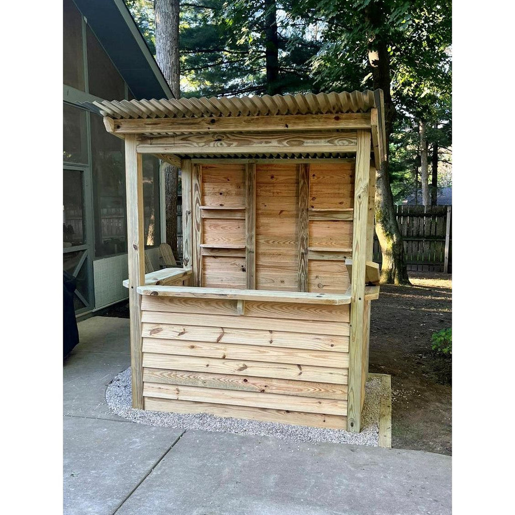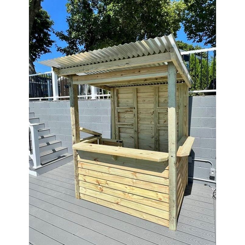 Meet the Temple Bar - our smallest but very impressive model! Measuring 6'-0" wide x 4'-0" deep, there is plenty of space to stock it with your favorite beverages using cooler boxes, beer fridges or splash out with your own kegerator (all sold separately). The bar counter space will comfortably seat 4+ people. The structures are built with the best of quality, pressure treated lumber enabling outdoor use year round. Customers can easily stain their finished products to achieve the best look for their backyard (as shown in the photos). The roof structure is a hard wearing galvanized corrugated steel.