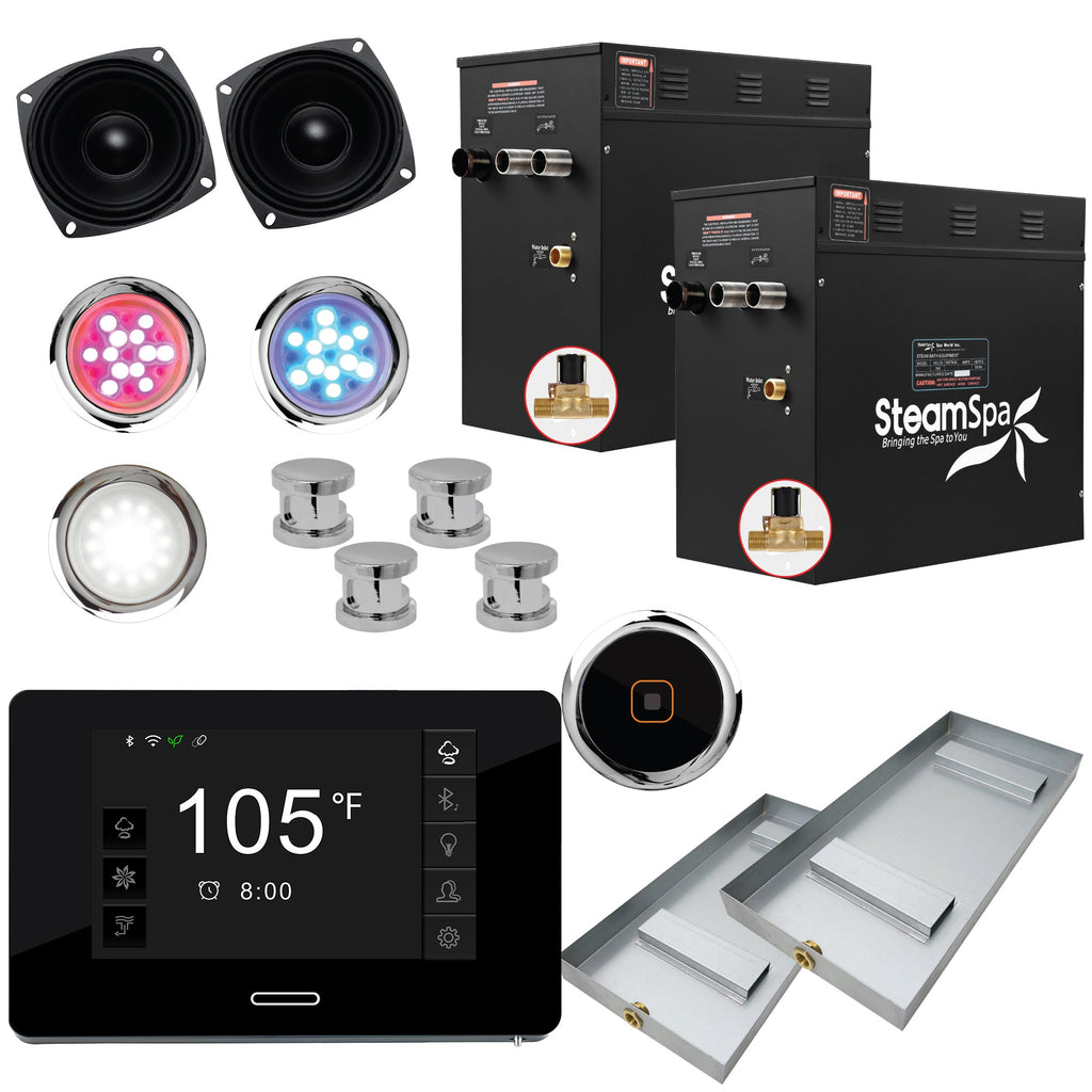 COMPLETE SPA PACKAGE: Includes generator, touchscreen control, steamhead, WiFi receiver, speakers, lighting, drain pan, and aroma oil
