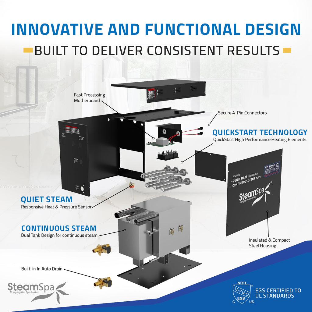 Elevate your daily routine by turning your bathroom into a personal wellness sanctuary. Our Black Series steam bath generators are designed to deliver powerful, enveloping steam and gentle heat that soothe the body and mind. Experience the health benefits of steam therapy—deep muscle relaxation, improved circulation, and stress relief—without leaving home. With advanced technology, wireless controls, and user-friendly operation, each unit offers the perfect blend of performance, efficiency, and luxury. Discover the art of modern relaxation with a premium steam bath system made for everyday indulgence.