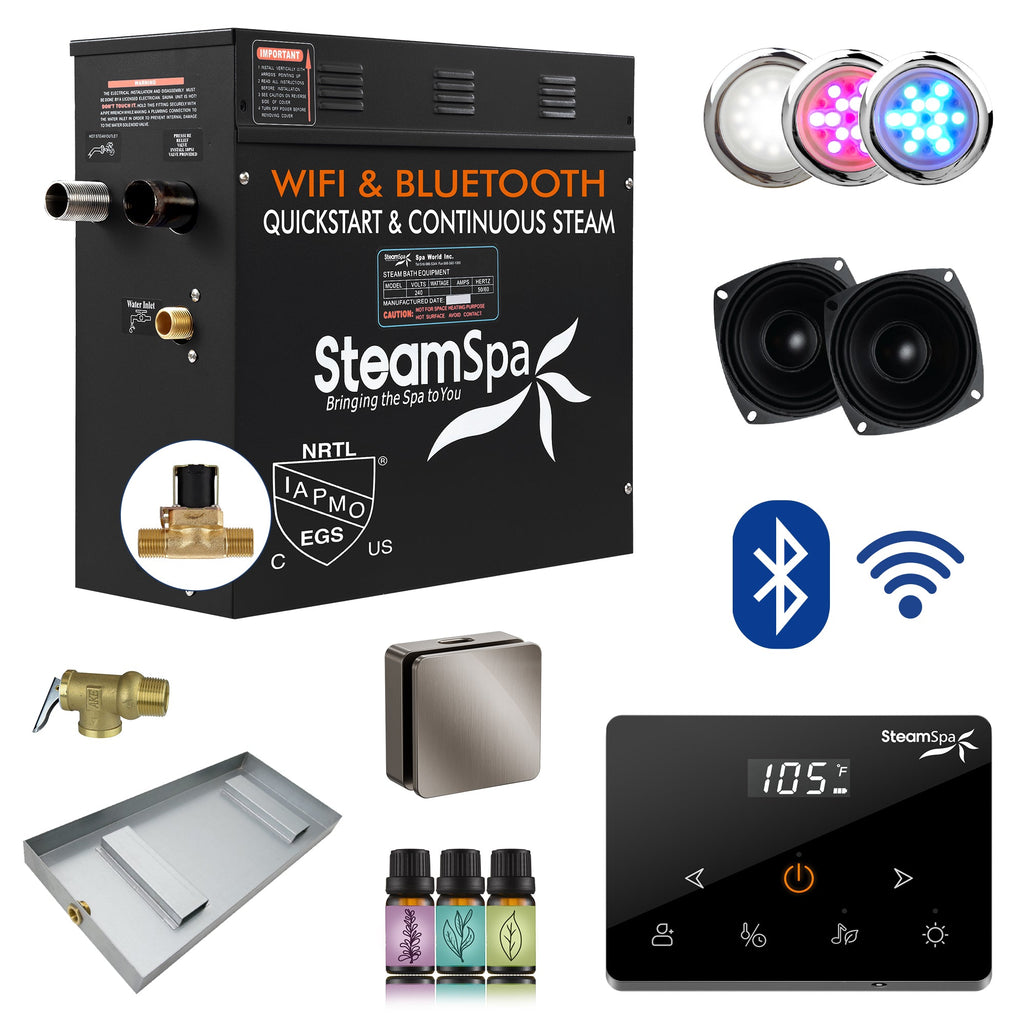 INCLUDES EVERYTHING YOU NEED: Complete steam system with generator, wireless control pad, dual steamheads, speakers, lights, drain pan, pressure relief valve, and aroma samples.