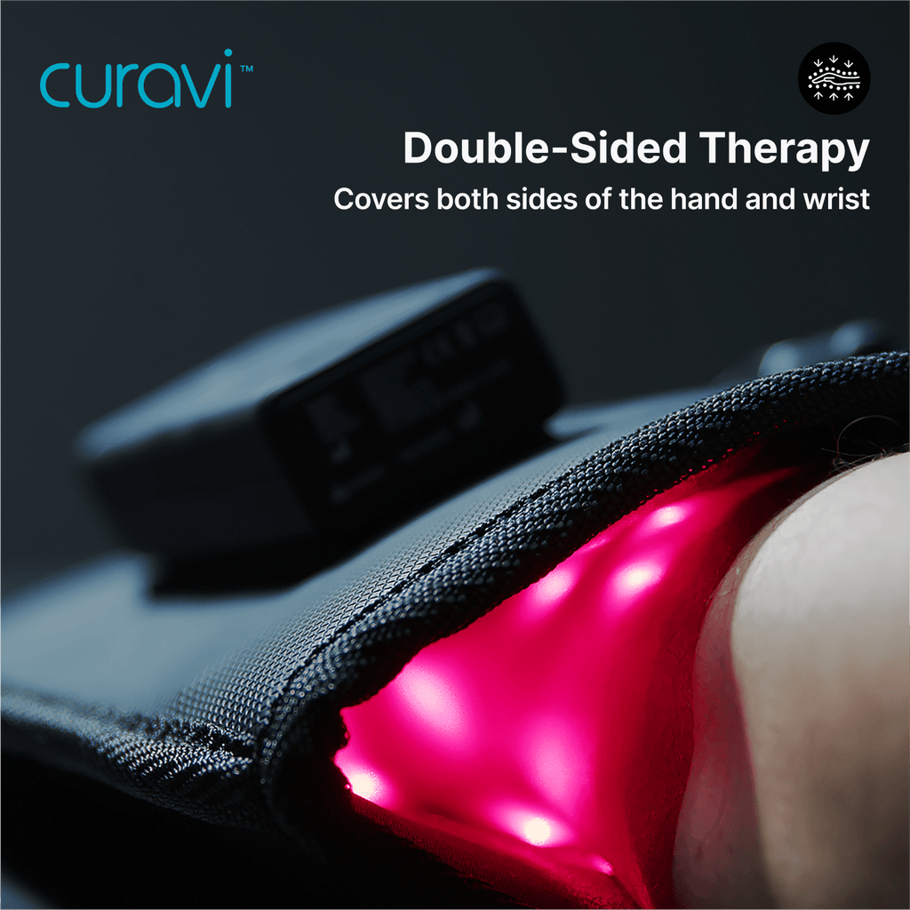 The Curavi Glove™ is a wearable, FDA-cleared laser therapy device designed to deliver soothing, temporary relief for mild to moderate hand and wrist discomfort. Using 104 medical-grade laser diodes, it provides deep-penetrating light therapy to support recovery from arthritis, carpal tunnel syndrome, tendonitis, and repetitive strain injuries.