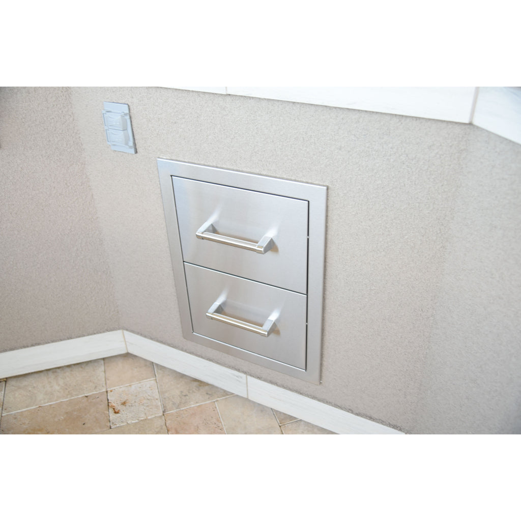 The Kokomo Grills 21" Stainless Steel Outdoor Kitchen Double Drawer is a premium addition to any outdoor cooking space. Built with durable 304 stainless steel, this double drawer unit offers large, fully enclosed storage that is both waterproof and fireproof. Designed for convenience and style, it adds a sleek, professional touch to your outdoor kitchen while keeping your essentials organized and easily accessible. Its polished bar handles and smooth ball-bearing glides ensure effortless operation, making it a must-have for luxury outdoor living.
