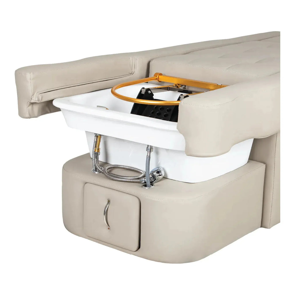 This multi-functional unit features both a head bowl and a foot bath, enabling seamless transitions between hair and foot care. A built-in USB charging port keeps devices powered throughout treatments. The adjustable headrest moves forward or backward to suit each client’s needs, while the upper section lifts for better access and comfort.