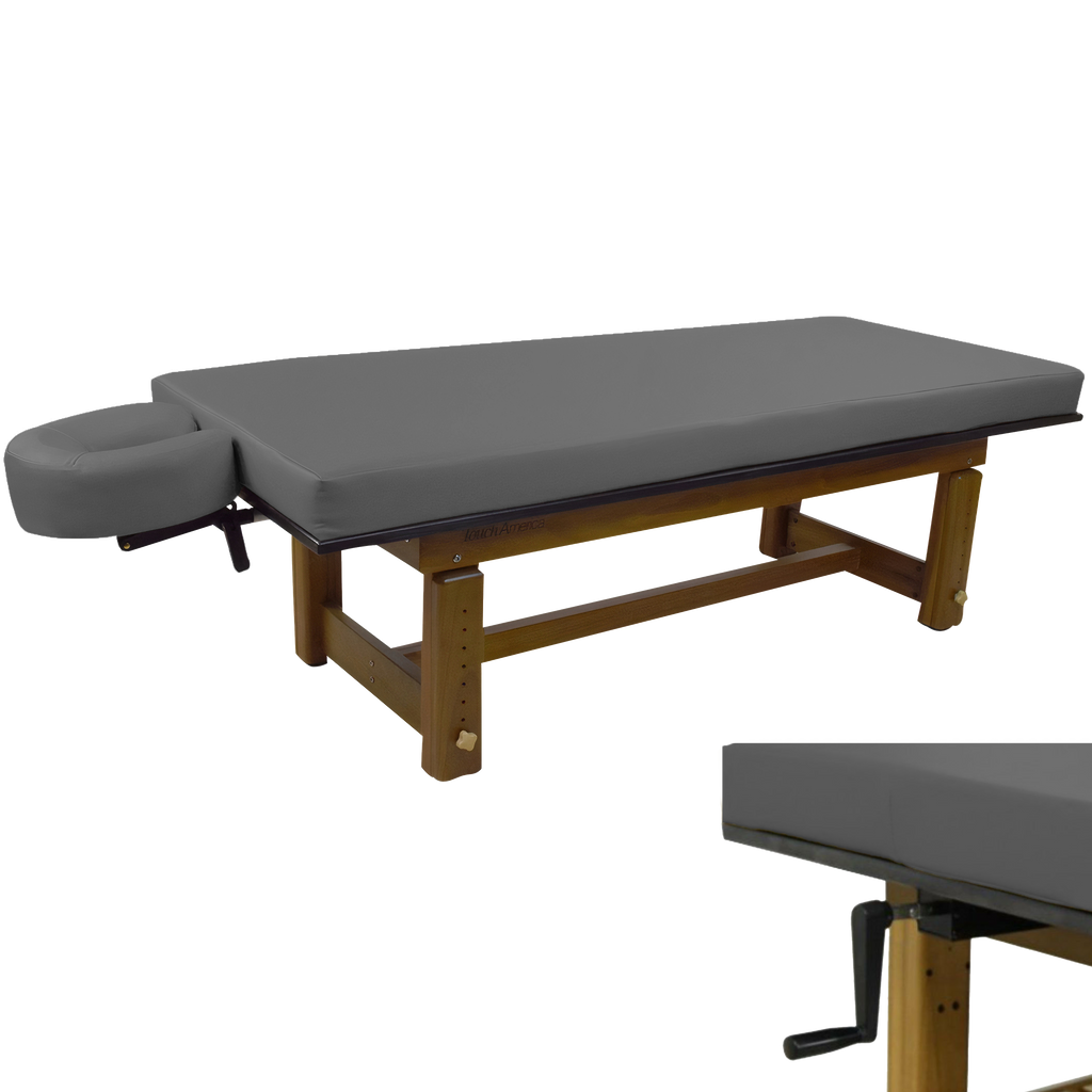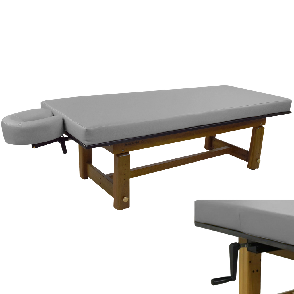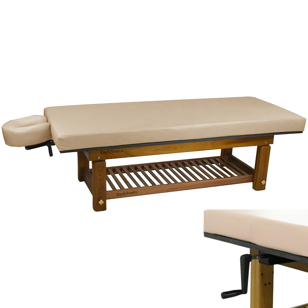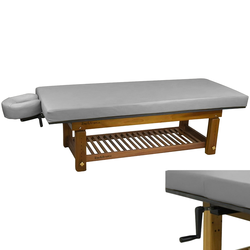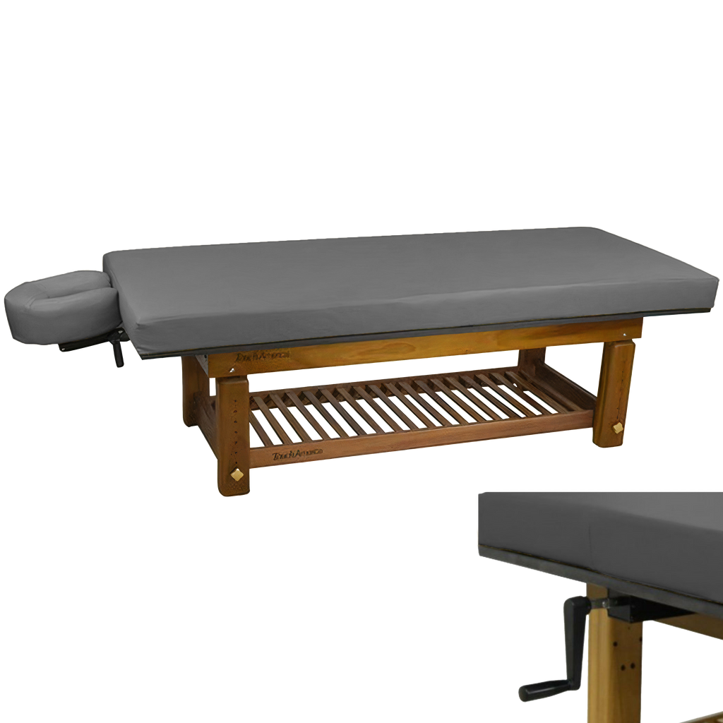 The richly polished teak frame highlights the natural grain of the wood, creating a grounded aesthetic that complements serene spa environments. A removable upholstered top with a plush 3” memory foam cushion provides lasting comfort for massage and bodywork services. The Solterra is available with either a manual height adjustment or a hand-crank hydraulic lift, allowing the working height to be set anywhere between 24” and 33”.