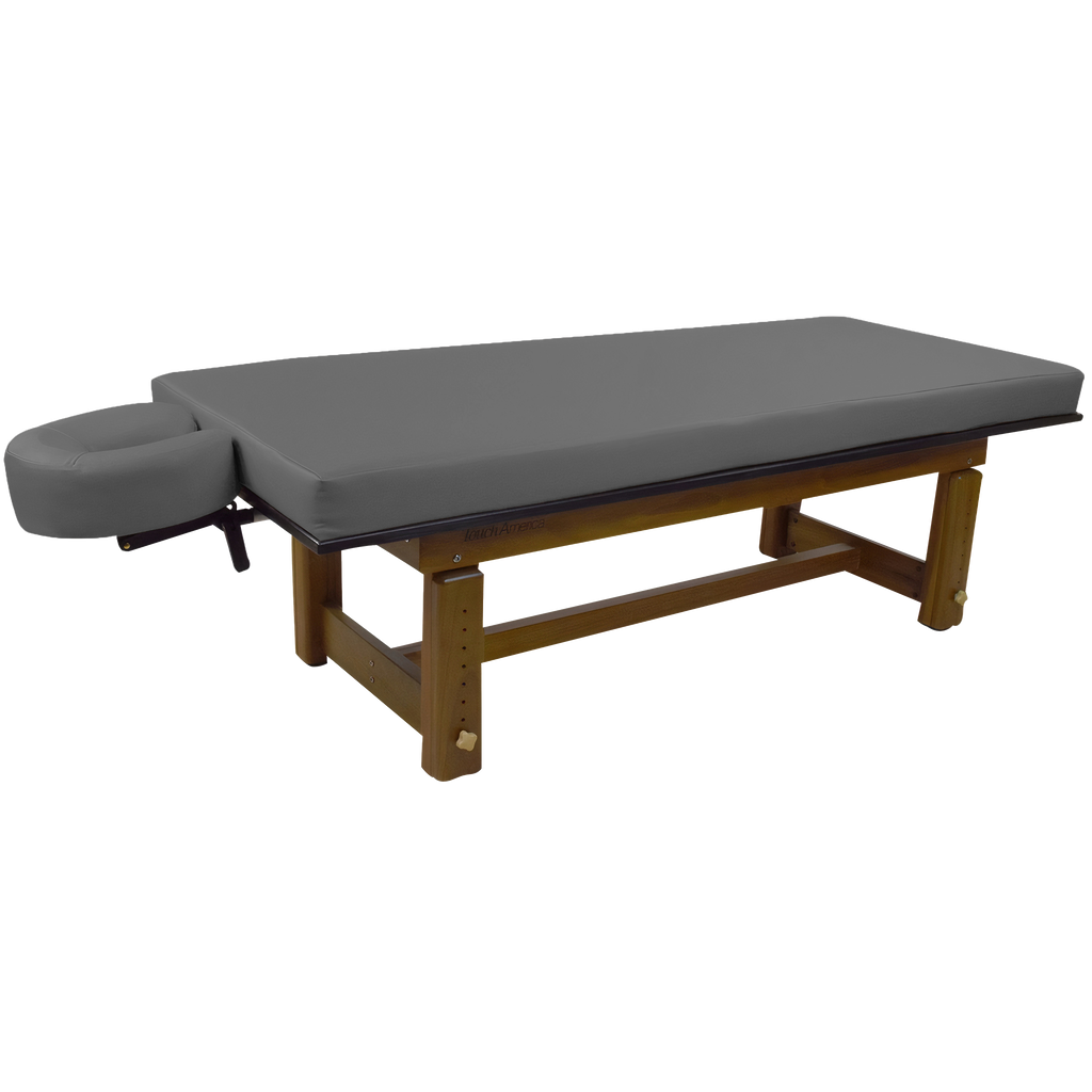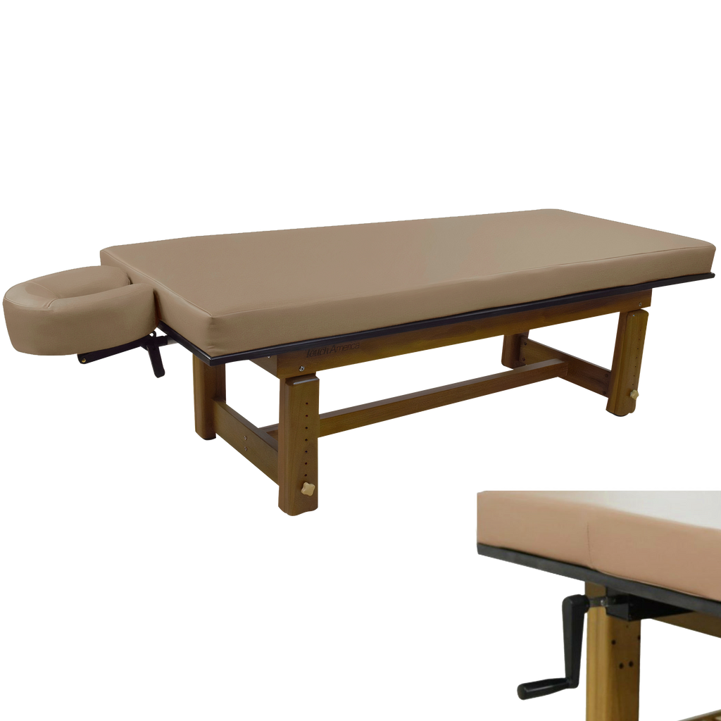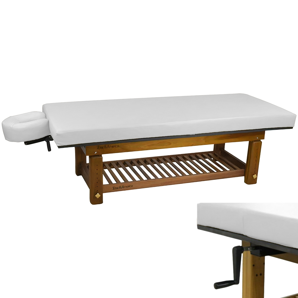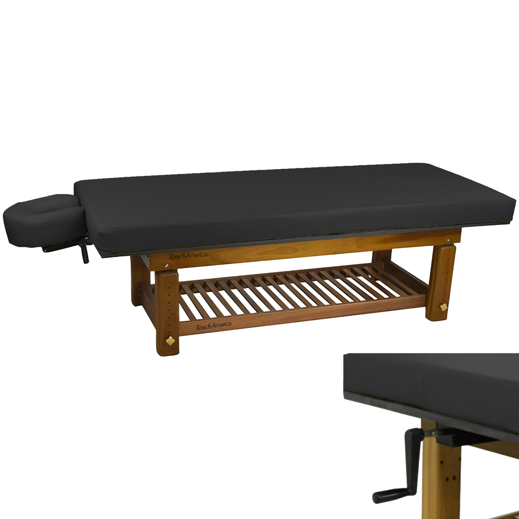 The richly polished teak frame highlights the natural grain of the wood, creating a grounded aesthetic that complements serene spa environments. A removable upholstered top with a plush 3” memory foam cushion provides lasting comfort for massage and bodywork services. The Solterra is available with either a manual height adjustment or a hand-crank hydraulic lift, allowing the working height to be set anywhere between 24” and 33”.
