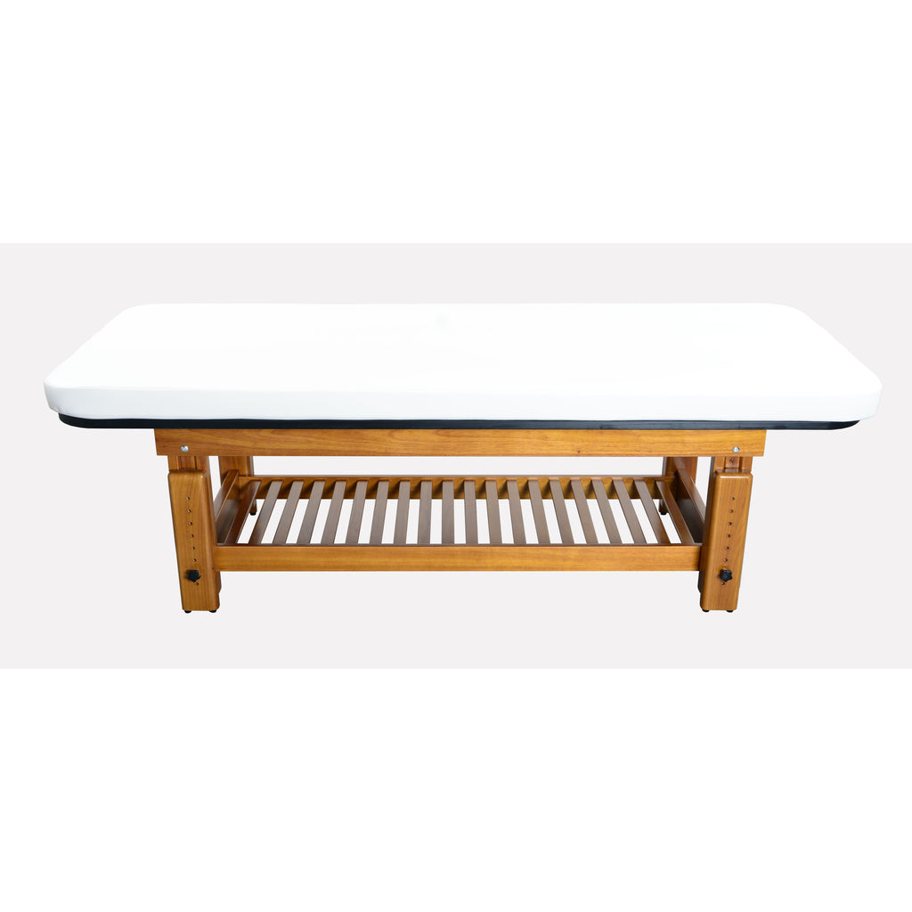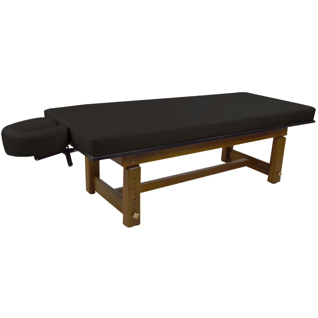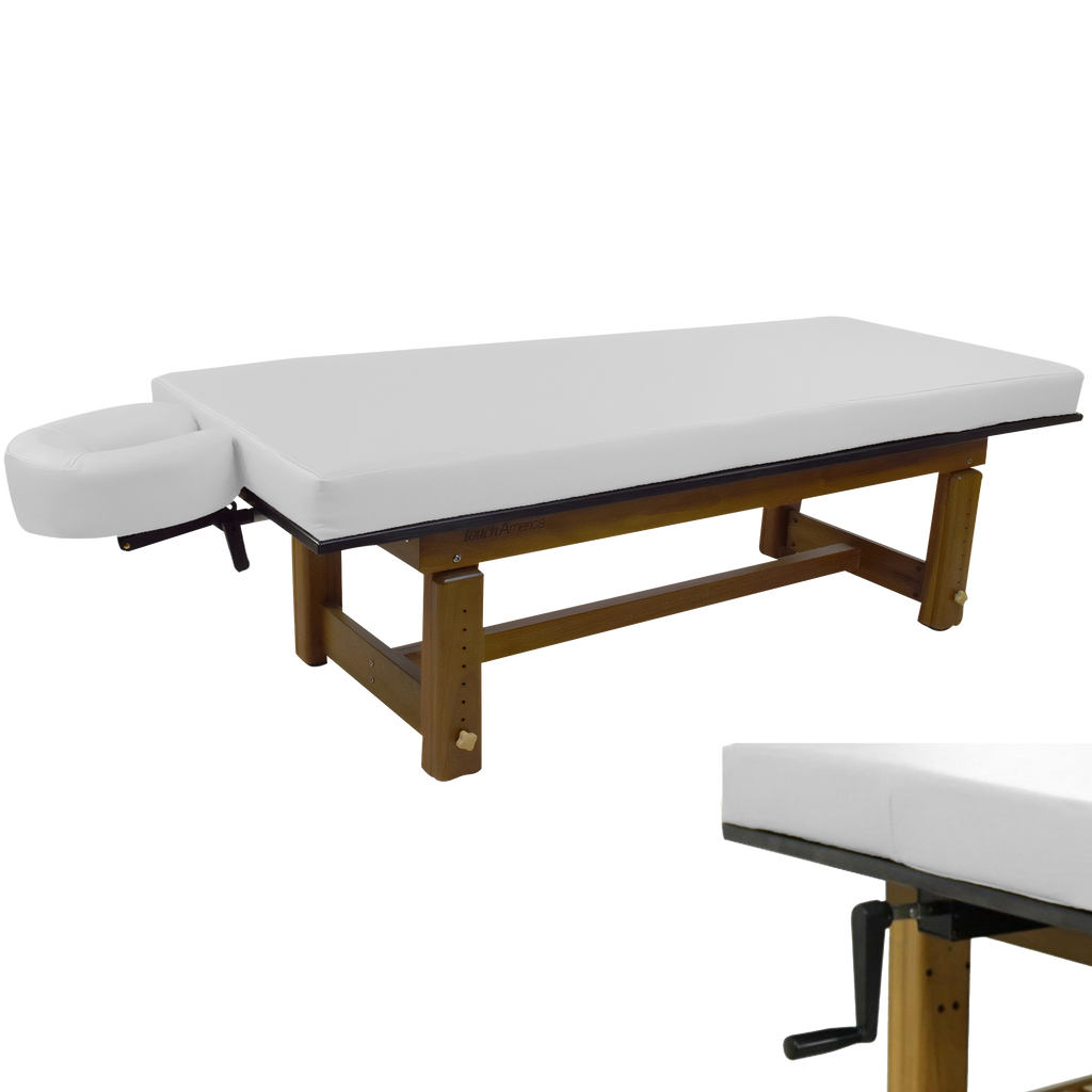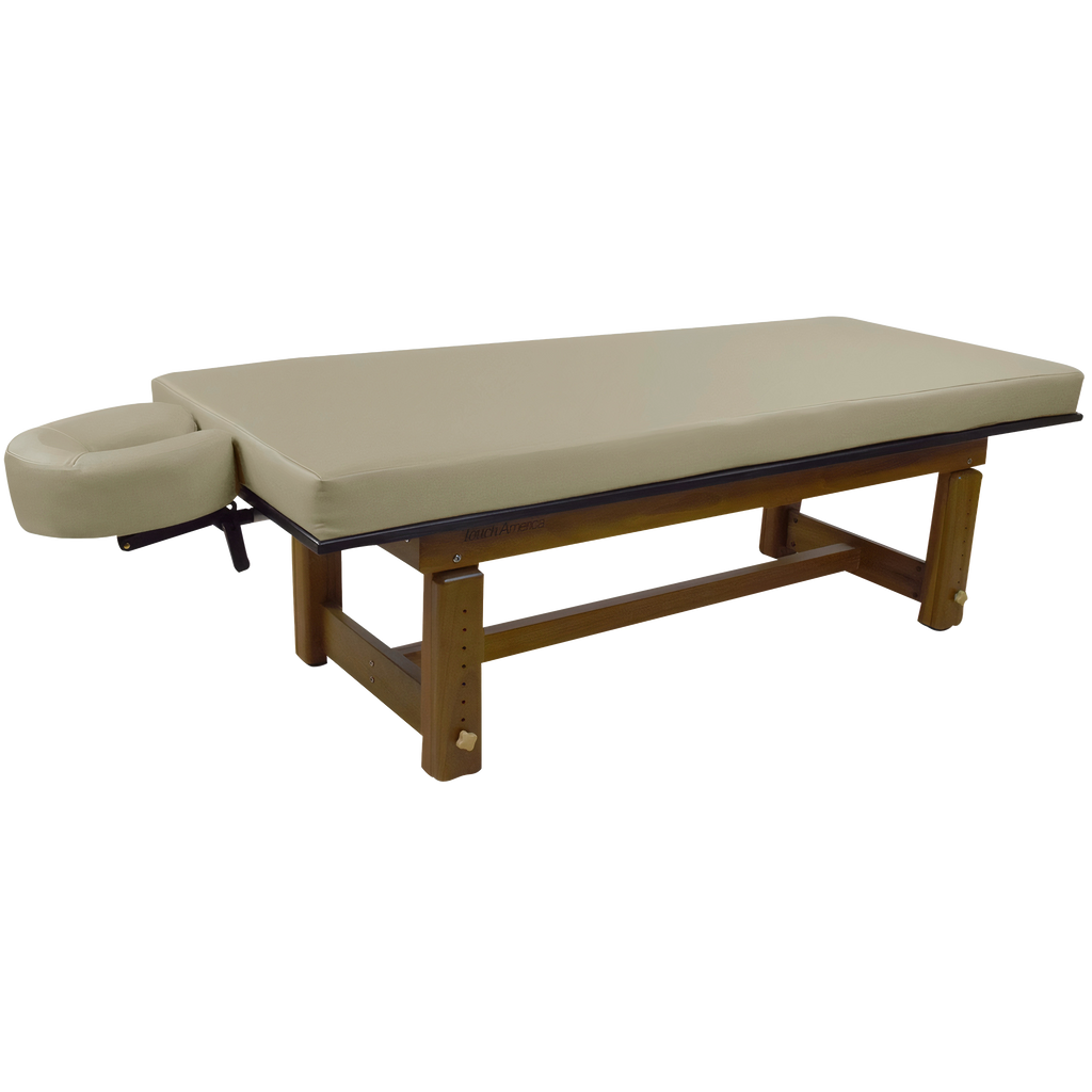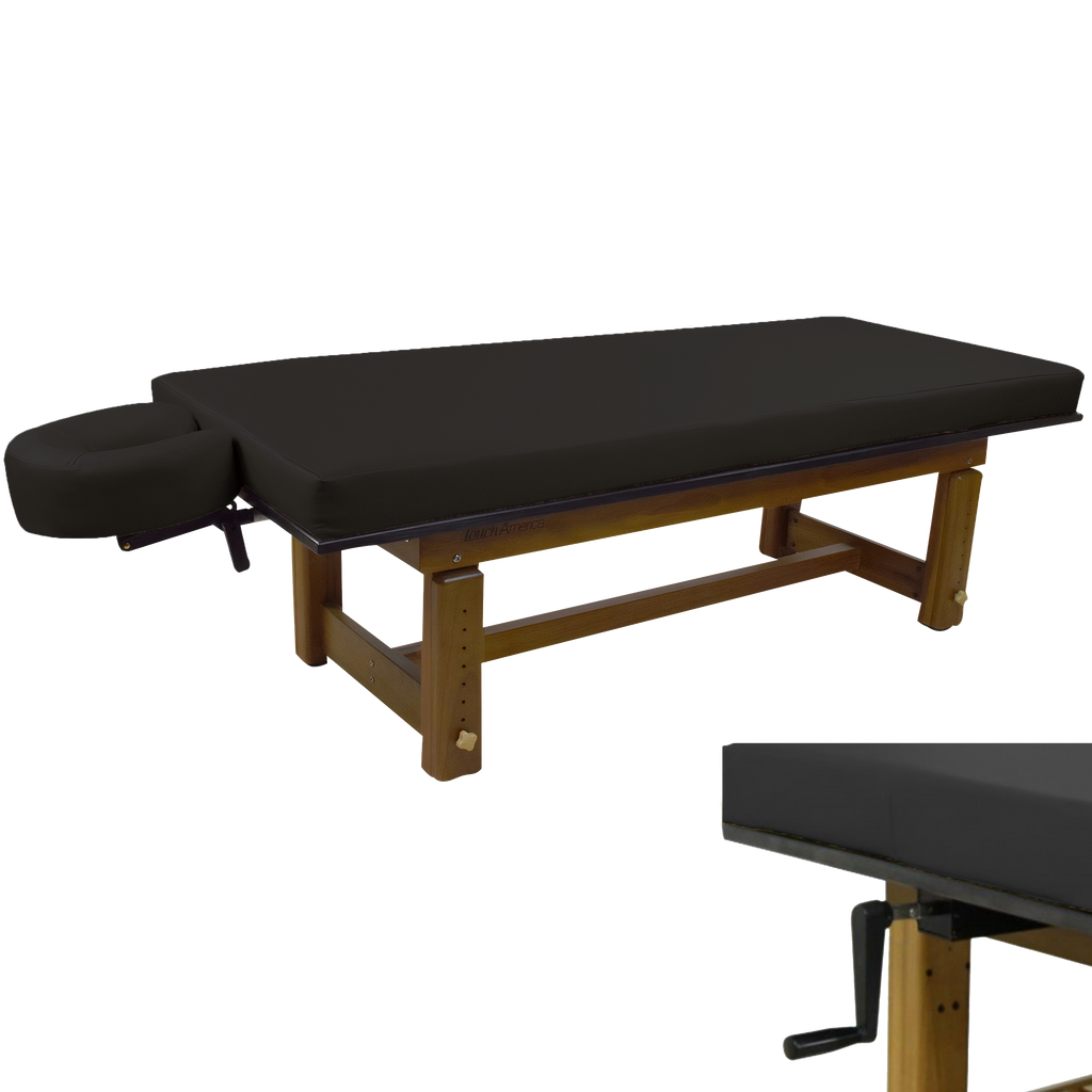 The richly polished teak frame highlights the natural grain of the wood, creating a grounded aesthetic that complements serene spa environments. A removable upholstered top with a plush 3” memory foam cushion provides lasting comfort for massage and bodywork services. The Solterra is available with either a manual height adjustment or a hand-crank hydraulic lift, allowing the working height to be set anywhere between 24” and 33”.