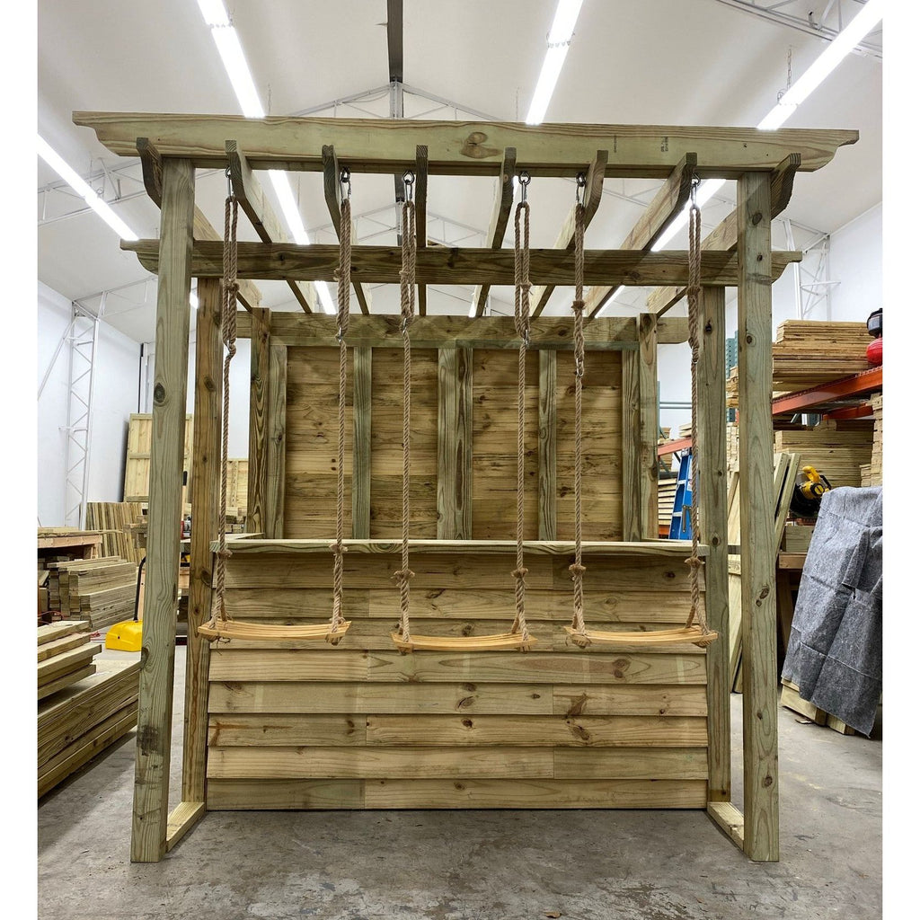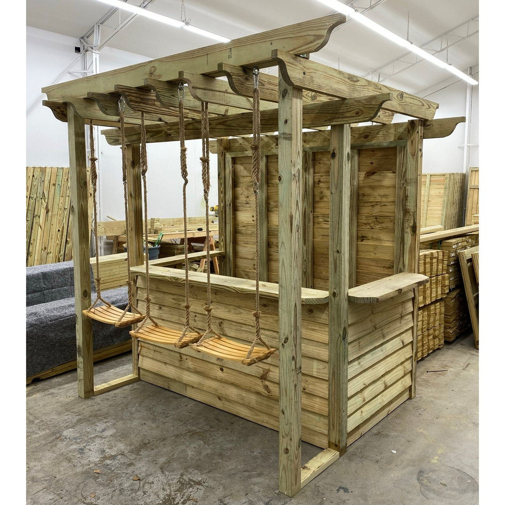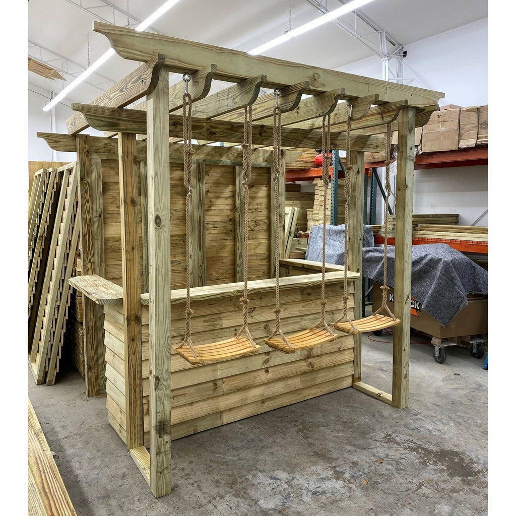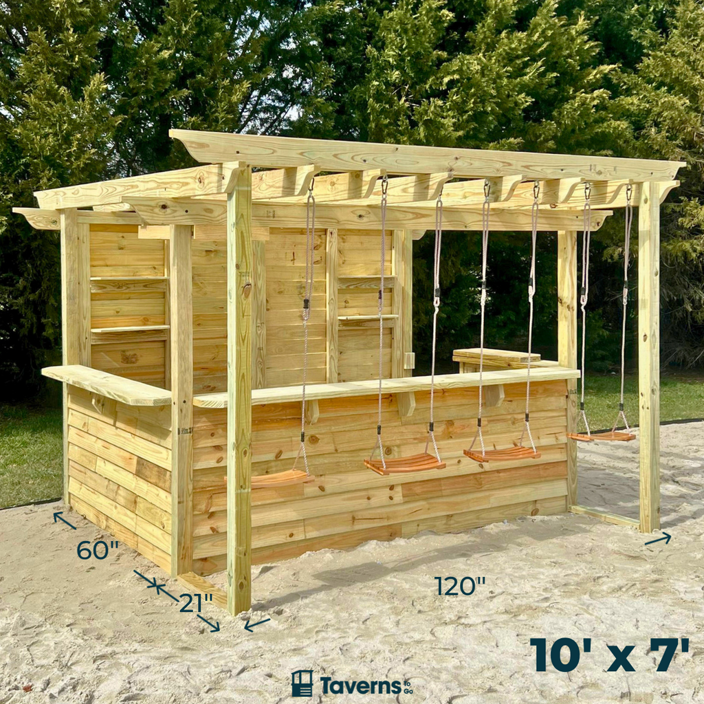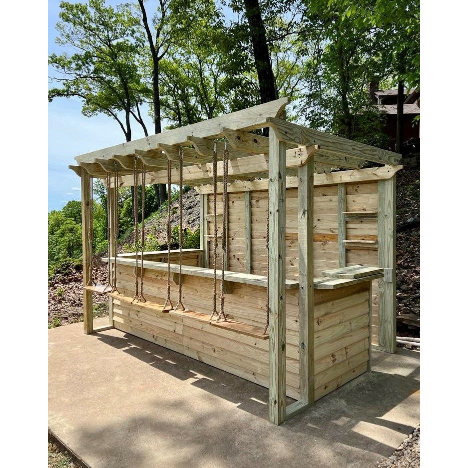 Swing up your bar game with an outdoor bar with built-in swings! This model is available in our original design with corrugated roofing, or with a pergola roof.