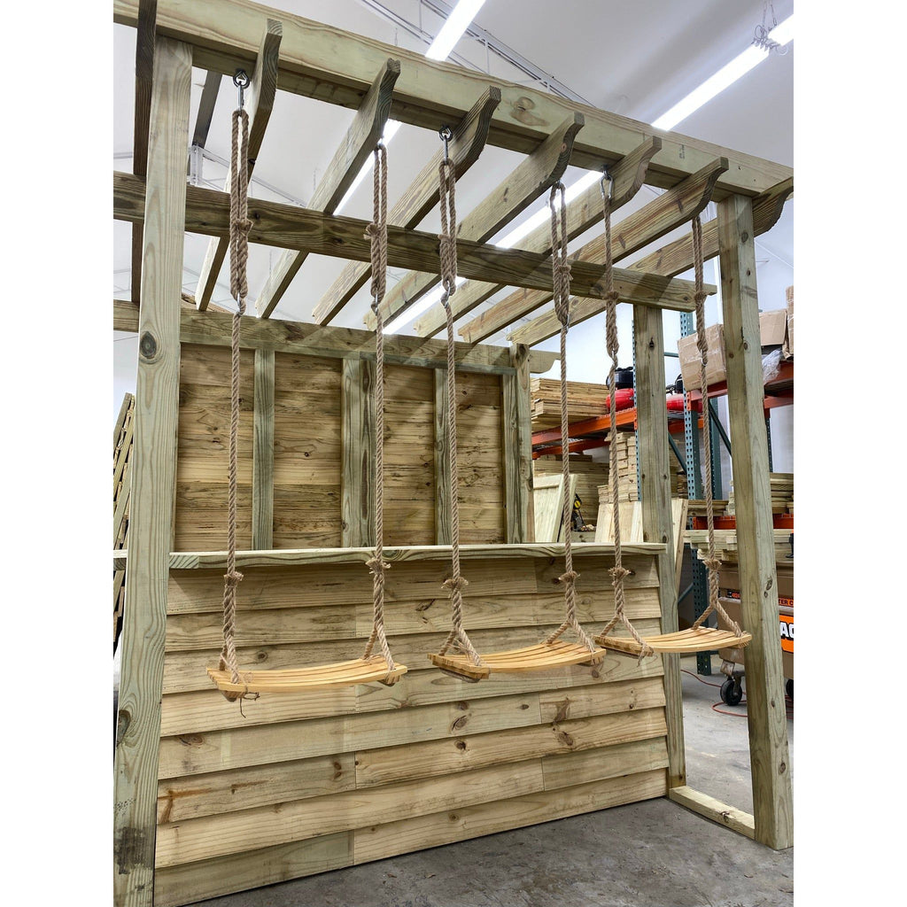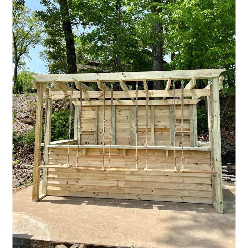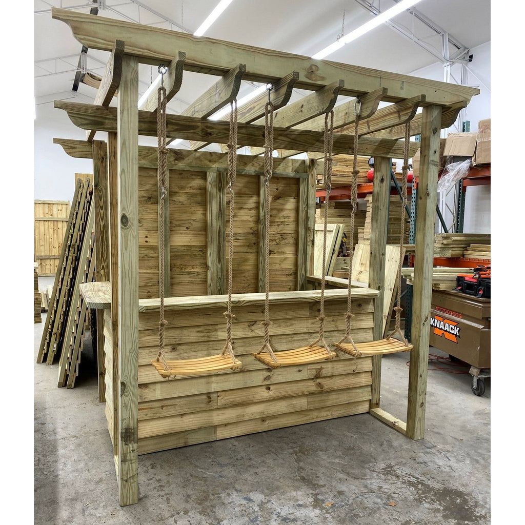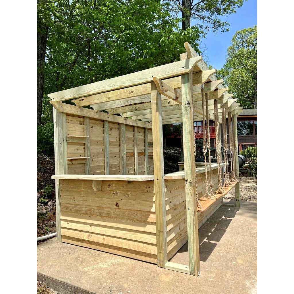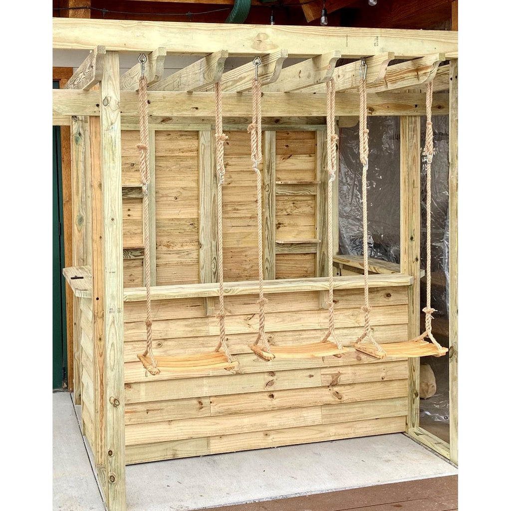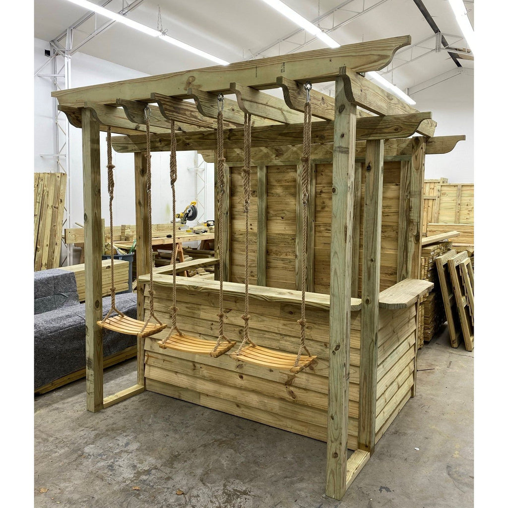 Swing up your bar game with an outdoor bar with built-in swings! This model is available in our original design with corrugated roofing, or with a pergola roof.