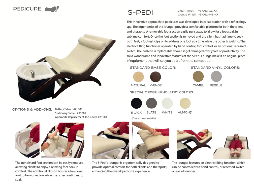 The S-Pedi Lounger offers a distinctive, space-efficient way to deliver pedicure services with elevated comfort, thoughtful engineering, and a professional aesthetic that stands apart in any spa setting.